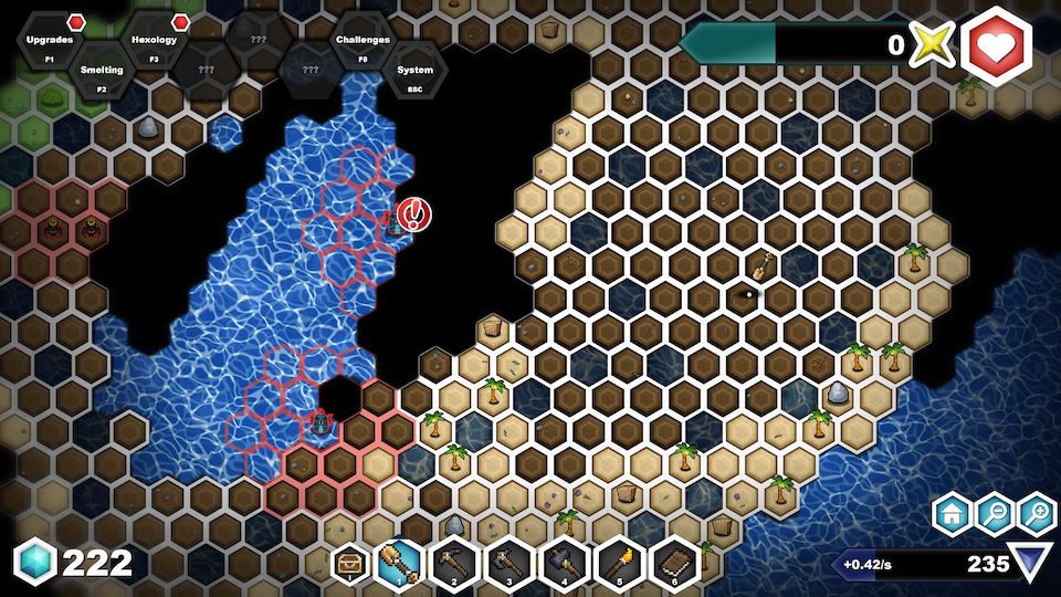 One part Minecraft, one part bubble wrap simulator. HexIsle has the trappings of an idle game but none of the idle components. You appear on a massive island full of hex tiles, objects, and monsters. Your goal is to harvest resources from these tiles, fight monsters, and gather objects to level up your tools and abilities to further explore the island.