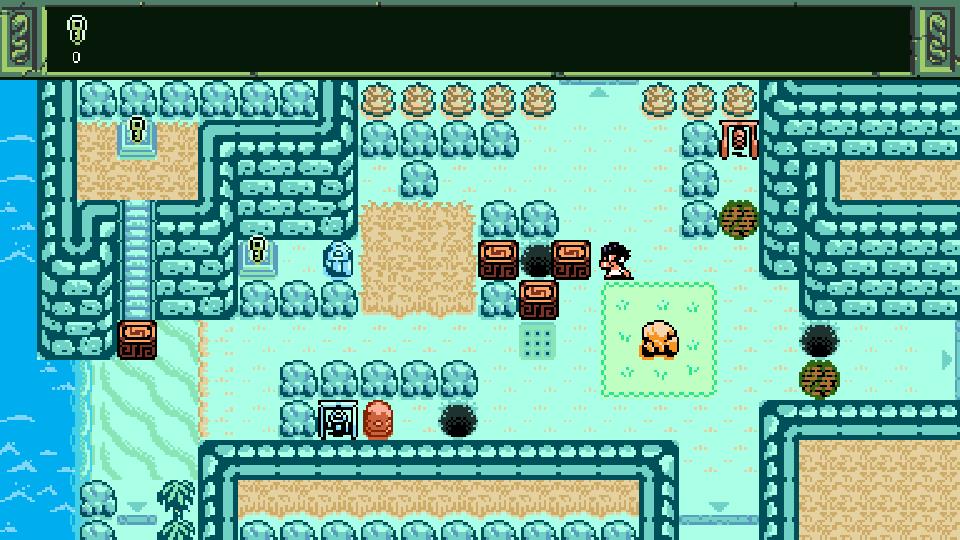 Sea & Sky presents itself in a Gameboy Color motif. The world is an archipelago navigated on a giant turtle. The music is tropical and the design seemingly sourced in Pacific Island culture. The atmosphere is ideal for a tropical island adventure. Information is conveyed environmentally, and most of the time fairly well.