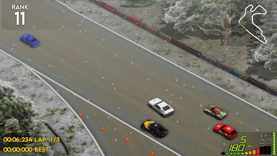 There's a variety of options from endurances races, rally, K-cars, GP cars. It all mostly manifests in the same isometric engine and confusing tank controls. You get used to them though; then the speed rumps up and you have to get used to them again. Around the 2/3rd point, you're going too fast to react to turns; you have to memorize tracks and watch the minimap.